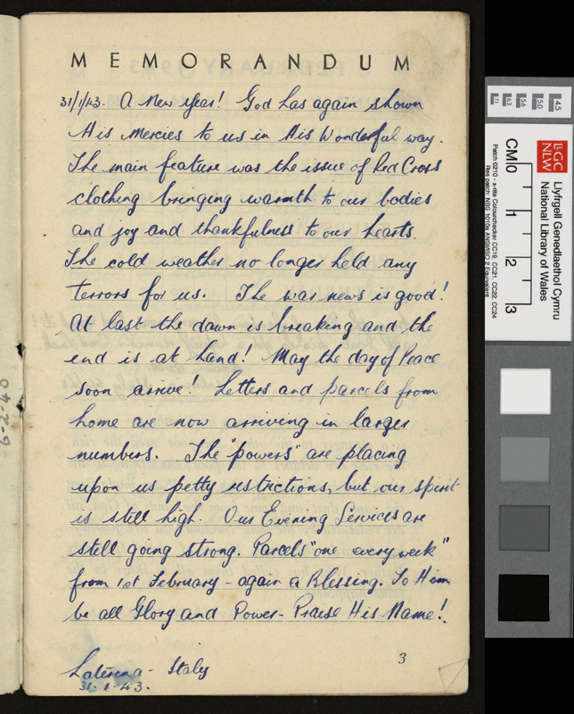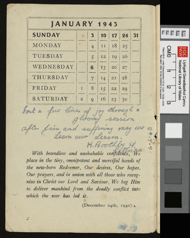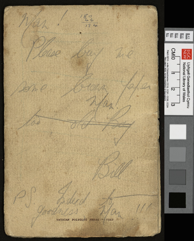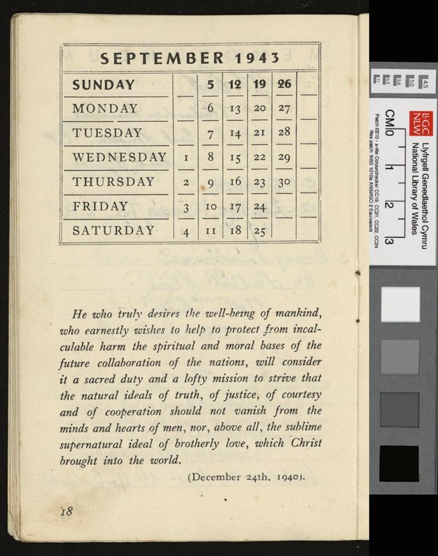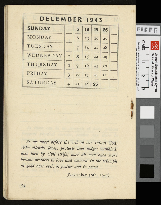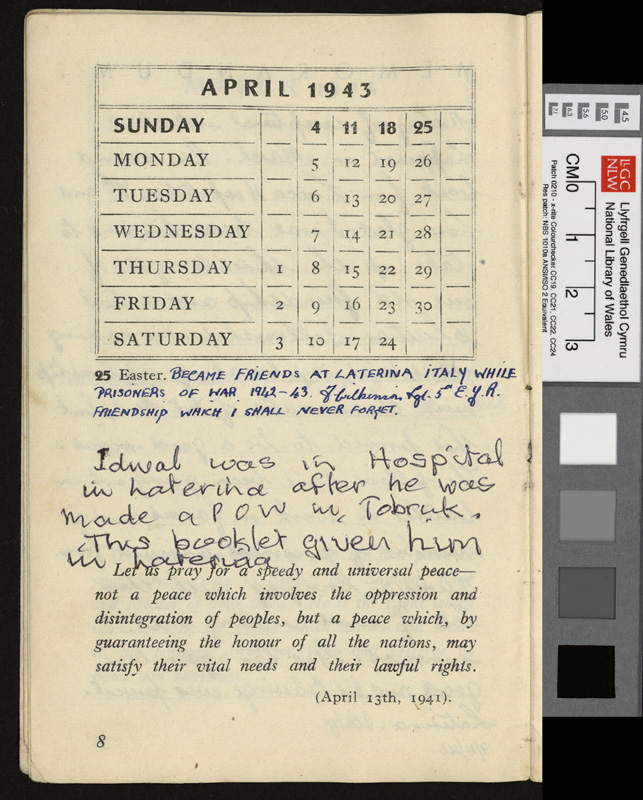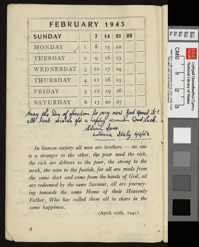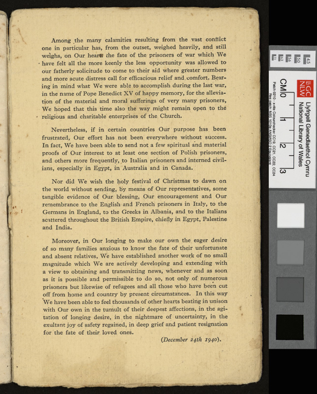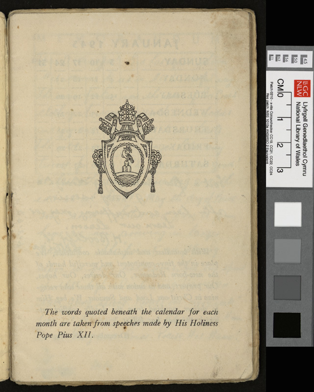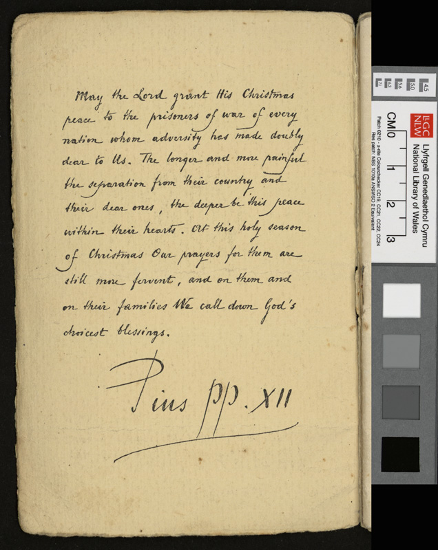 A pamphlet given as a gift to every prisoner of war in Italy by Pope Pius XII at Christmas 1942, including a calendar and a number of Christmas Carols. It contains notes by Idwal Davies as well as comments by other prisoners and various addresses, 1943.